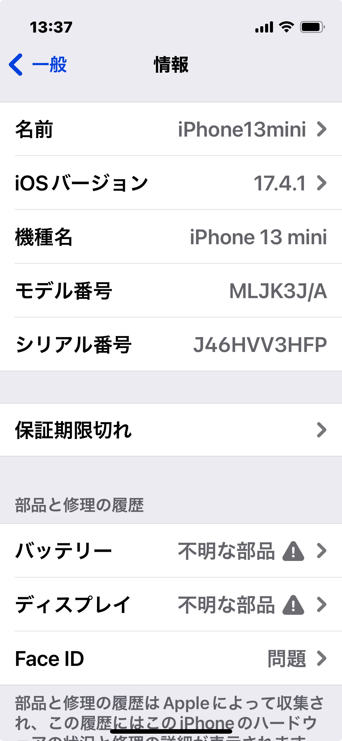 ちなみにこの写真は私のiPhone13miniなのですがパネル交換とバッテリー交換を行っている状態の情報の画像です。